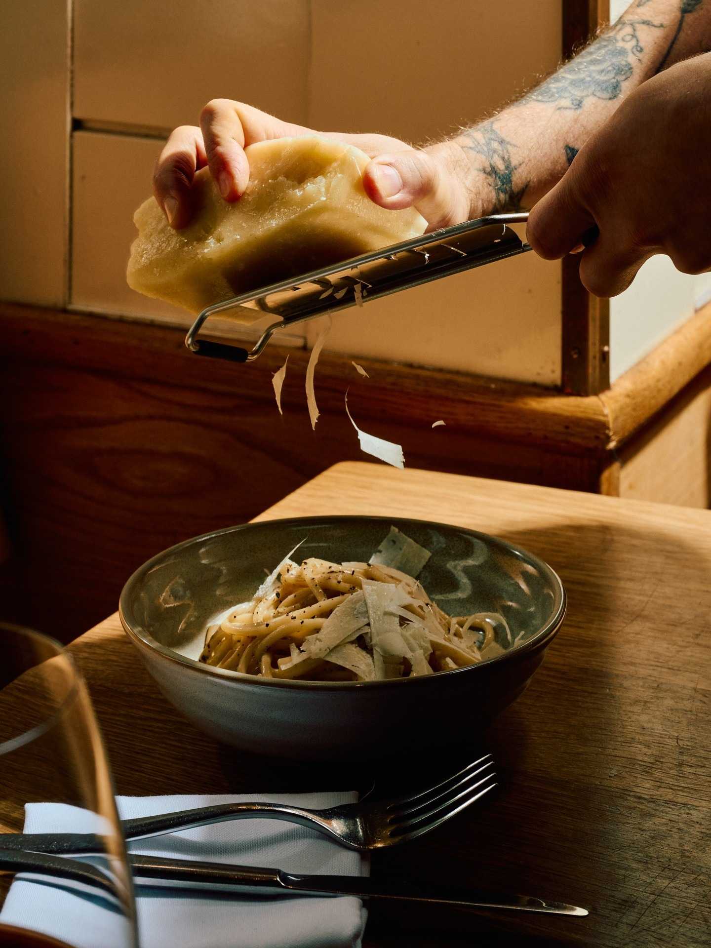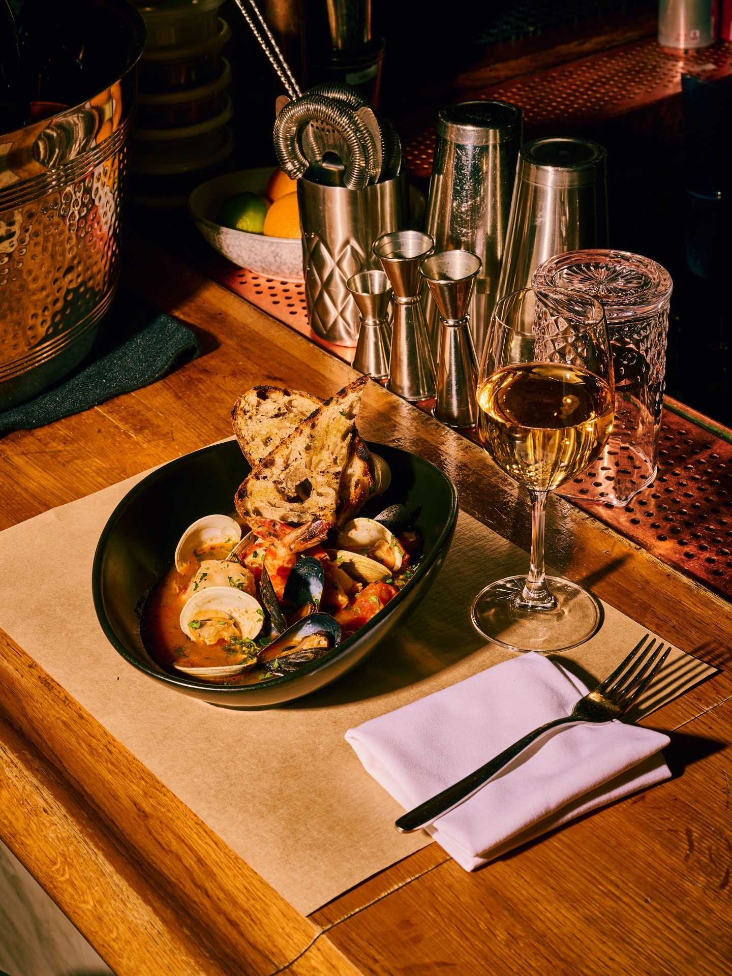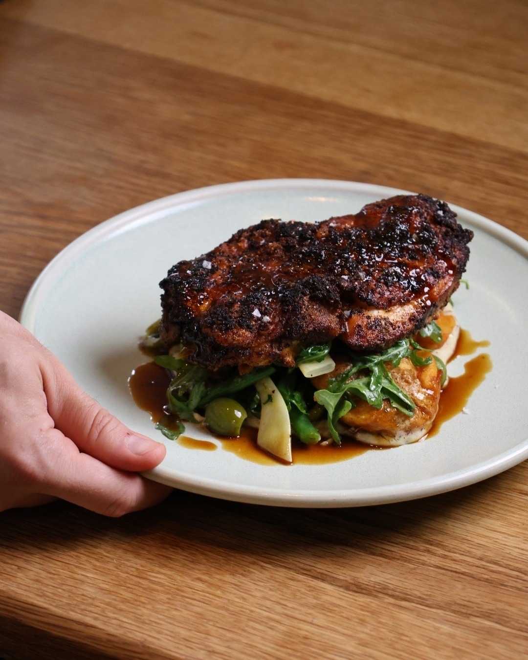 Handsome wood, lush leather = sophisticated vibe. Brasserie-esque spot’s dynamic-intimate. Menu’s artful: starters, mains, sides with that Upland touch.